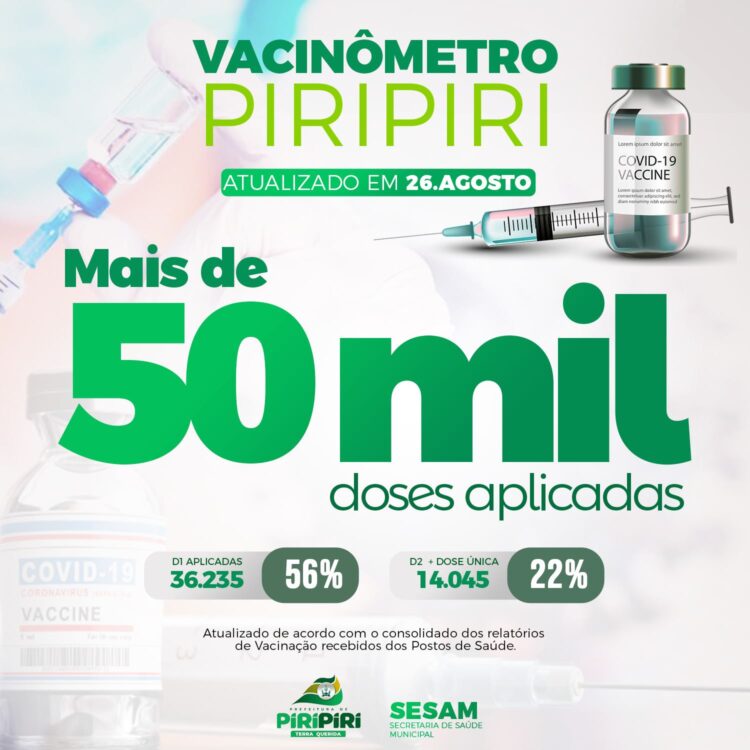 Vacinômetro | Piripiri ultrapassa a marca de 50 mil doses administradas. Mais de 56% da população receberam a primeira dose da vacina contra a covid-19.