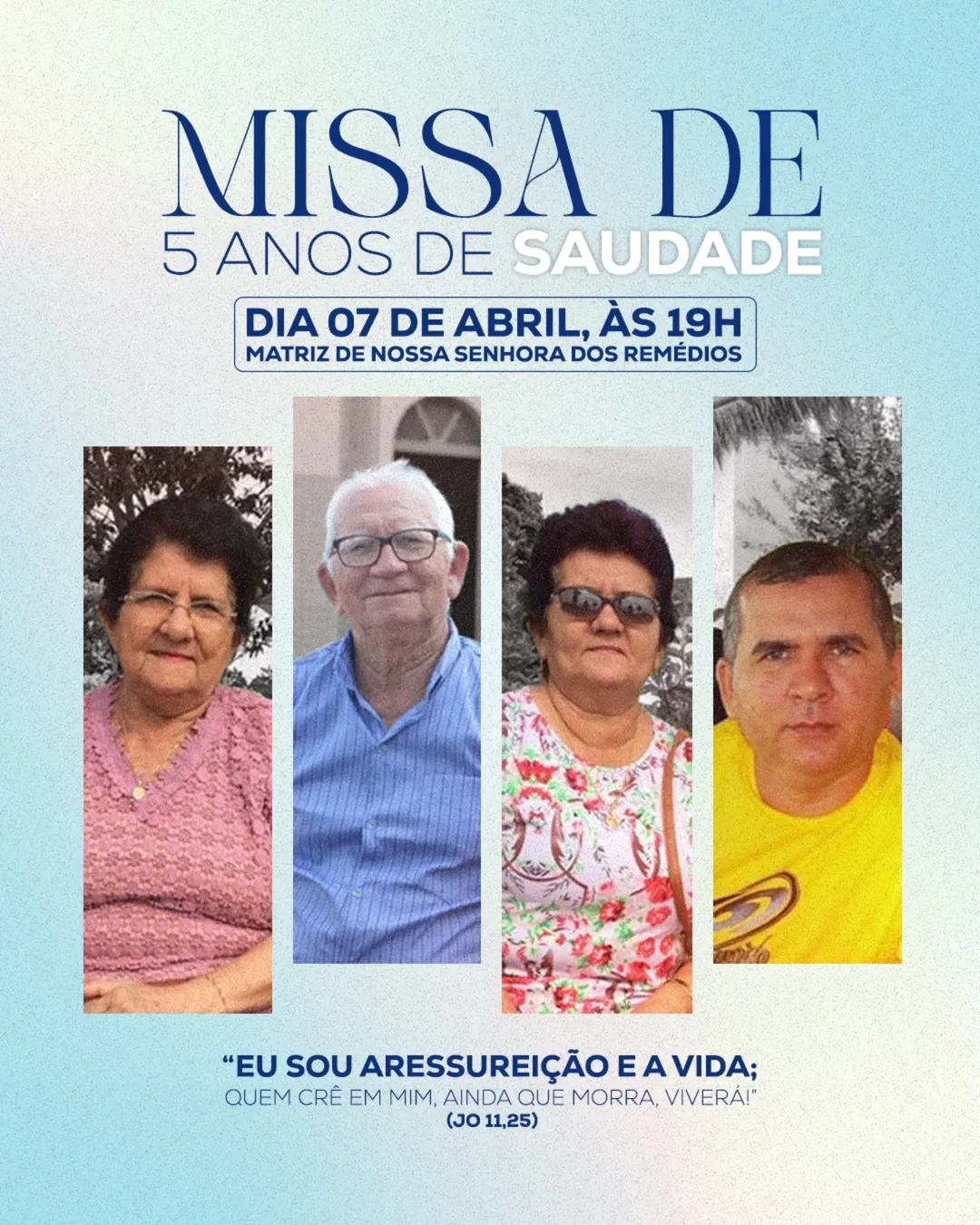 A Matriz de Nossa Senhora dos Remédios receberá, nesta terça-feira, 07 de abril, às 19h, uma Missa especial marcada pela fé, memória e esperança. A celebração será presidida pelo padre Gilvan Manuel, que recordará os cinco anos de falecimento de seus pais e dois irmãos, vítimas da Covid-19.