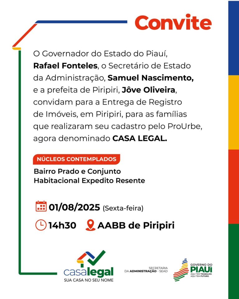 O Governo do Estado do Piauí, por meio da Secretaria da Administração (Sead), anuncia nesta sexta-feira (1º) a reformulação do Programa de Regularização Fundiária Urbana Específica (ProUrbe), que passa a se chamar Casa Legal. O lançamento da nova fase do programa ocorre no município de Piripiri, durante solenidade de entrega de mais de 1.000 registros de imóveis a moradores da cidade. O evento será realizado na sede da AABB, a partir das 14h30, com a presença do governador Rafael Fonteles.