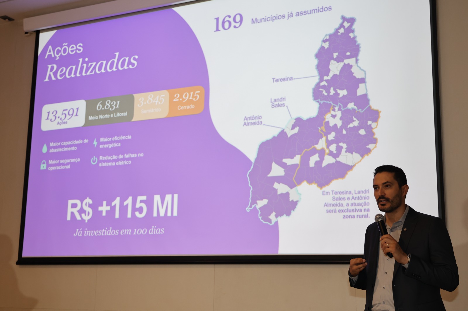 Desde o início da operação no Estado, a Águas do Piauí tem investido em ações estruturantes e emergenciais para garantir o abastecimento. Nos primeiros 70 dias, mais de R$ 60 milhões foram aplicados em todo o Piauí. O resultado já pode ser visto: a produção de água aumentou em 2,4 milhões de litros por hora, volume suficiente para abastecer uma cidade de 240 mil habitantes. Nesse período, foram instaladas 590 bombas, 90 cloradores, 163 transformadores e realizadas 3.636 ações operacionais nas regiões Meio Norte/Litoral, Semiárido e Cerrado. As melhorias incluem troca de equipamentos obsoletos, modernização de sistemas, recuperação de unidades e reativação de estruturas.