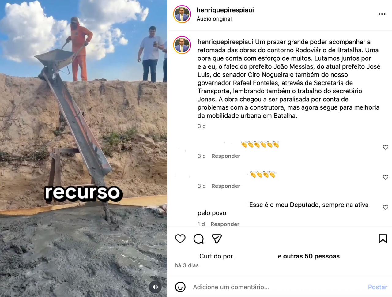 O deputado estadual Henrique Pires (MDB) voltou a reforçar a ação do senador Ciro Nogueira (Progressistas) para o andamento das obras do Rodoanel de Batalha -que leva o nome Deputado Ciro Nogueira, pai do senador-, que têm avançado e é bastante aguardado pela população na região.