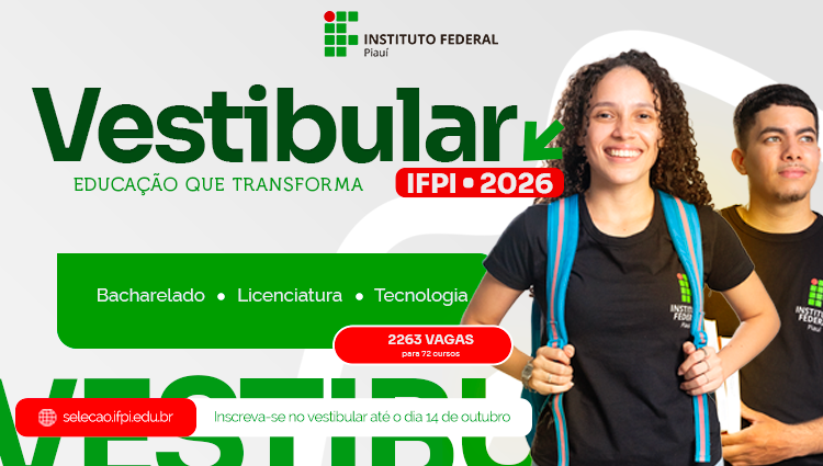 O Instituto Federal do Piauí divulga o edital do Vestibular 2026, com oferta de 2.263 vagas em 72 cursos superiores presenciais (tecnólogos, bacharelados e licenciaturas) nos campi Angical, Campo Maior, Cocal, Corrente, Floriano, José de Freitas, Oeiras, Parnaíba, Paulistana, Pedro II, Picos, Piripiri, São João do Piauí, São Raimundo Nonato, Teresina Central, Teresina Dirceu, Teresina Zona Sul, Uruçuí e Valença.
