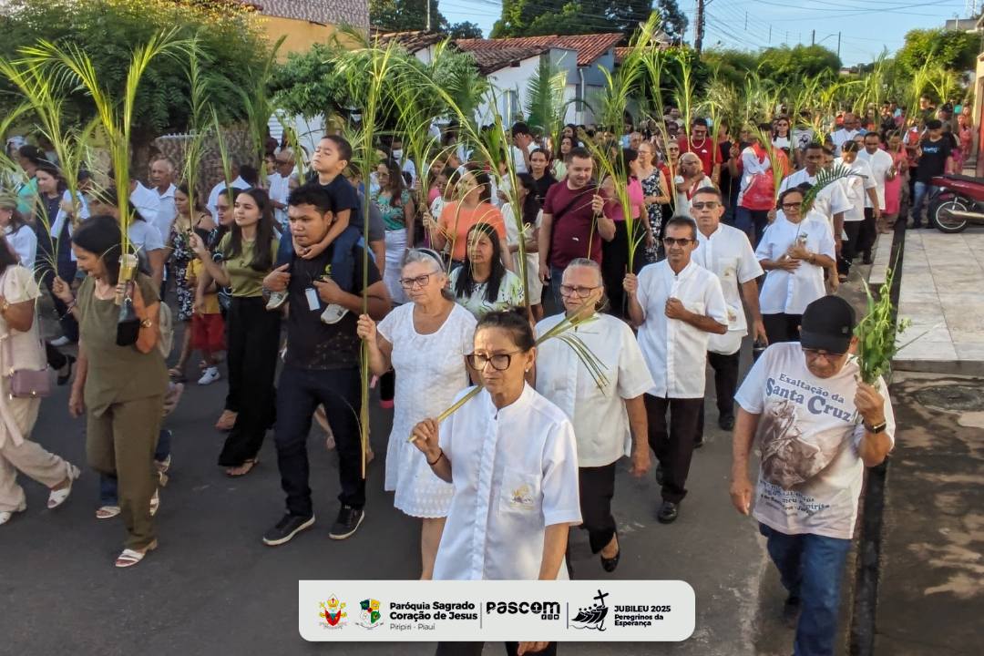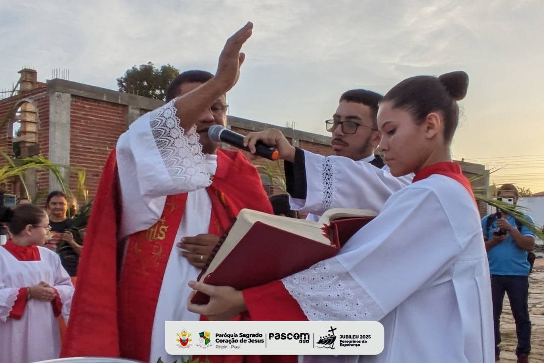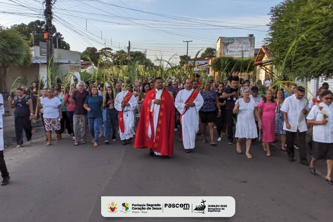 A procissão teve início com a bênção dos ramos, símbolo da vitória e da acolhida ao Cristo Rei, seguida por um percurso de oração e cantos, conduzindo os fiéis até a Igreja Matriz, onde foi celebrada a Santa Missa.