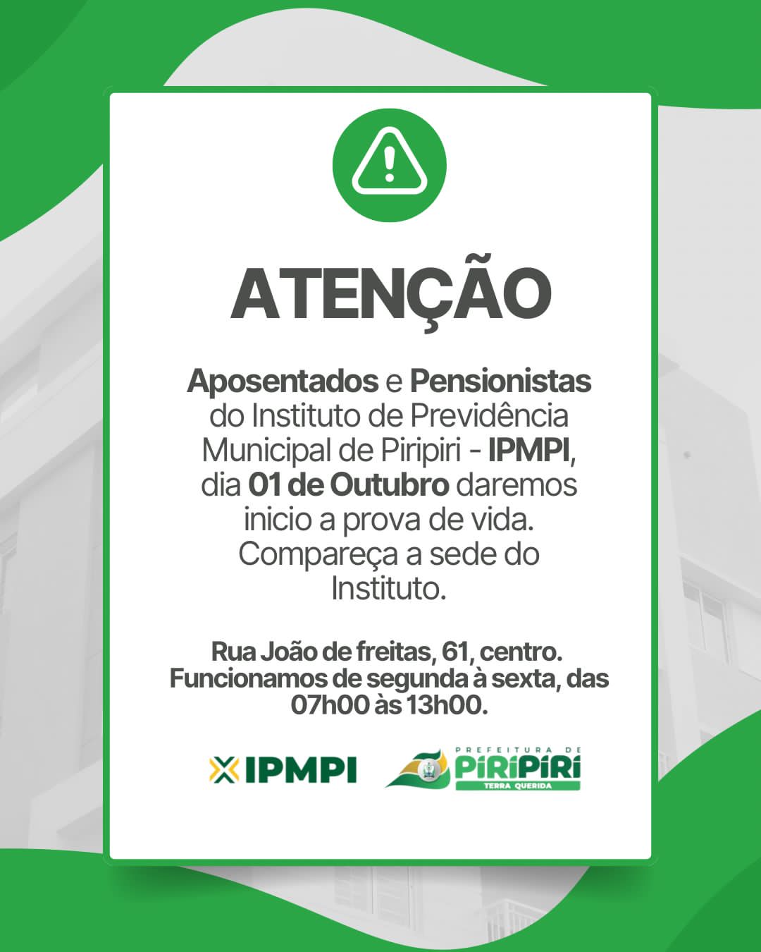 Tem início nesta quarta-feira(1°), a prova de vida de todos os aposentados e pensionistas,da Perfeitura de Piripiri, através do Instituto de Previdência Municipal de Piripiri-IPMPI.