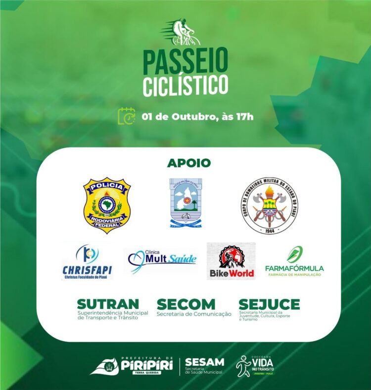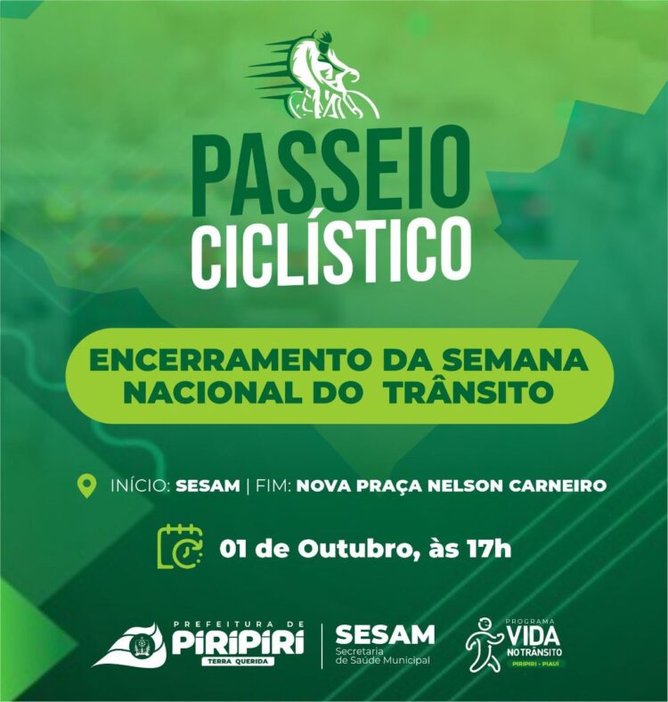 A Semana Nacional do Trânsito, em Piripiri, será finalizada nesta sexta-feira, 1º de outubro, a partir das 17h, com um passeio ciclístico que terá início na Secretaria de Saúde do Município de Piripiri (Sesam), na Av. Raimundo Holanda, encerrando na Praça Nelson Carneiro, no Bairro Estação.