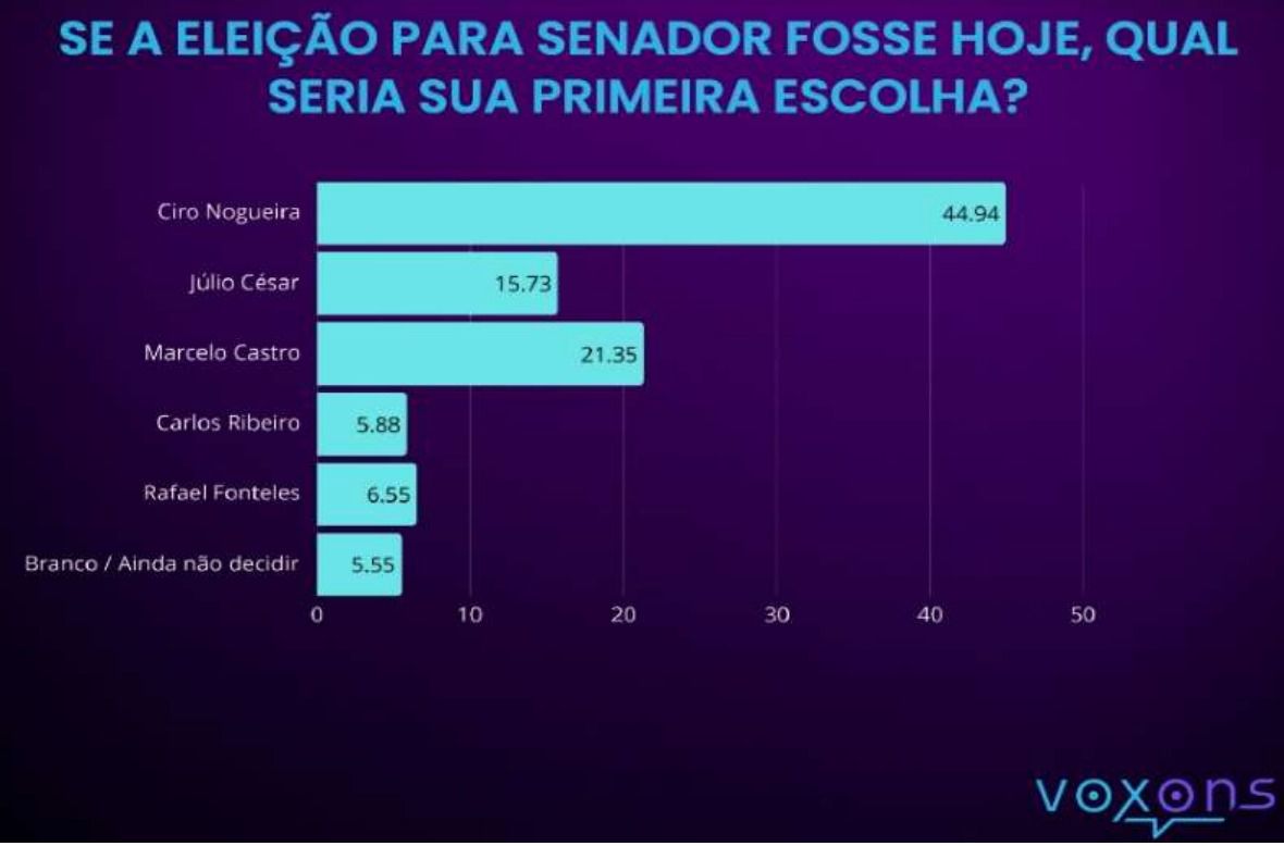 Segundo a pesquisa, questionado se a eleição fosse hoje, qual seria a sua primeira escolha, 44,9% preferem o senador Ciro Nogueira, que ficou em primeiríssimo lugar disparado. Bem atrás, estão, nesta ordem, o senador Marcelo Castro com 21,3%; e o deputado federal Júlio César Lima, com 15,7%.*Como pré-candidato a reeleição, senador Ciro Nogueira lidera disparado, segundo nova pesquisa*