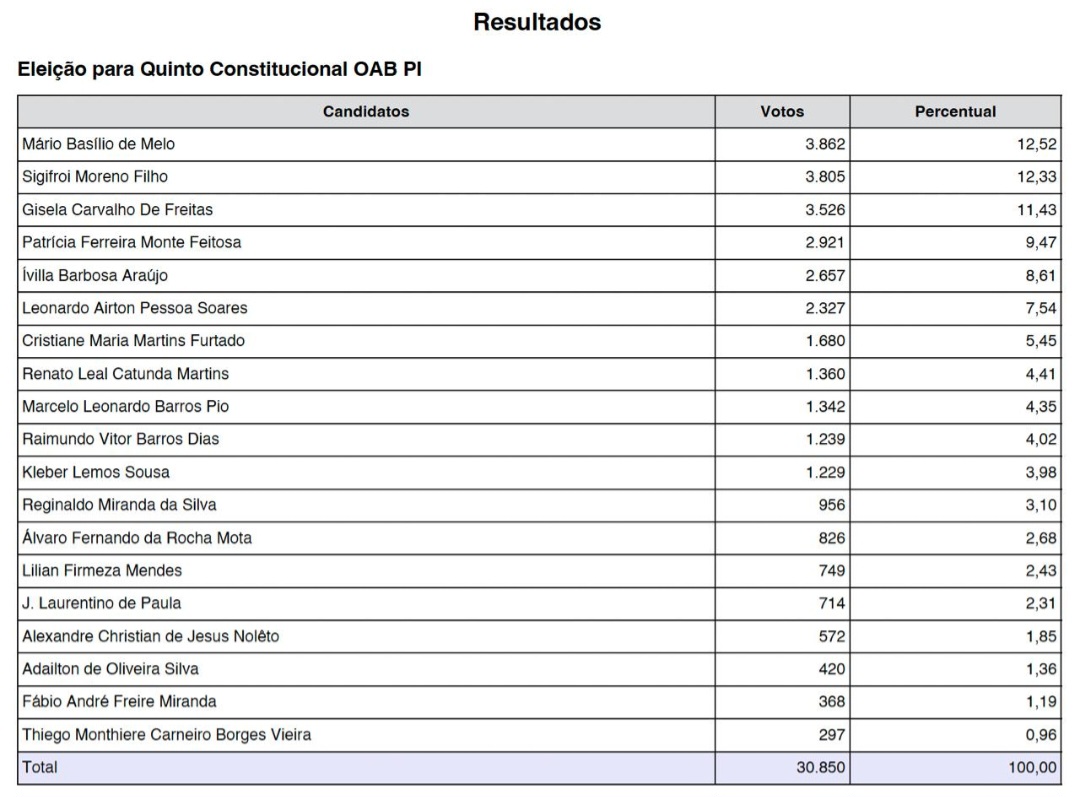 A PRIMEIRA FASE Comissão Eleitoral do Quinto Constitucional da OAB-PI divulgou, às 19h desta segunda-feira (22), o resultado oficial da votação online que definiu os 12 nomes mais votados pela advocacia piauiense para a vaga de desembargador(a) do Tribunal de Justiça do Piauí (TJ-PI).